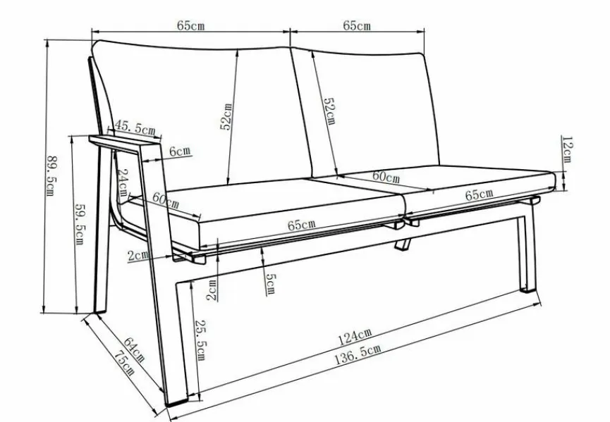 Sitzhöhe 33 cm; Sitztiefe: 60/57 cm; Sitzbreite 131/64/57 cm
