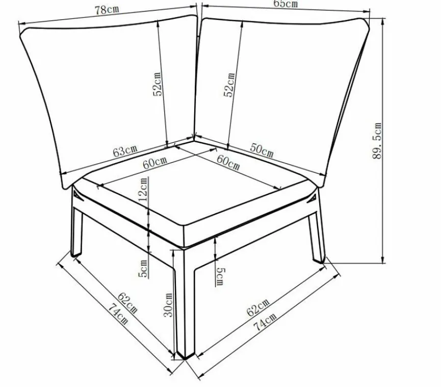 Sitzhöhe 33 cm; Sitztiefe: 60/57 cm; Sitzbreite 131/64/57 cm