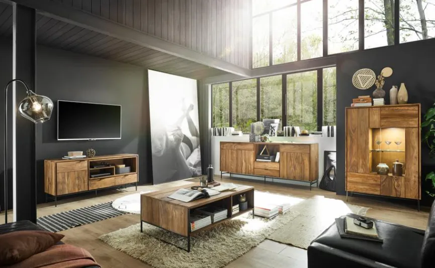 Lowboard Shiva nennt sich das moderne Möbel, das Ihr Wohnzimmer verschönert. Dafür sorgt die angesagte Holzoptik, die mit trendigen Industrial-Elementen kombiniert wurde. Sie können beispielsweise Ihren Fernseher auf das Sideboard stellen und in den Schubladen Ihre DVDs unterbringen. Aber auch in der Diele oder im Schlafzimmer findet das Lowboard Shiva seine Bestimmung, indem es toll aussieht und Stauraum für allerlei Kleinigkeiten bietet.