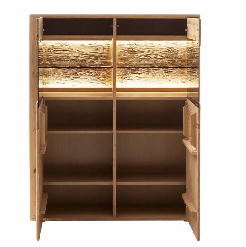 - Korpus aus Holzwerkstoff (Spanplatte) Ast/Balkeneiche furniert in Kristalleiche geölt, Front aus Ast/Balkeneiche massiv durchgehende Lamelle in Kristalleiche geölt