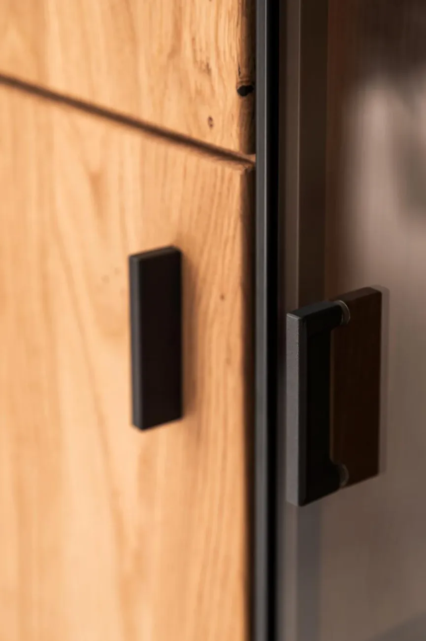 - Front aus Ast/Balkeneiche massiv, durchgehende Lamelle in Wildeiche geölt, Korpus aus Ast/Balkeneiche furniert in Wildeiche geölt