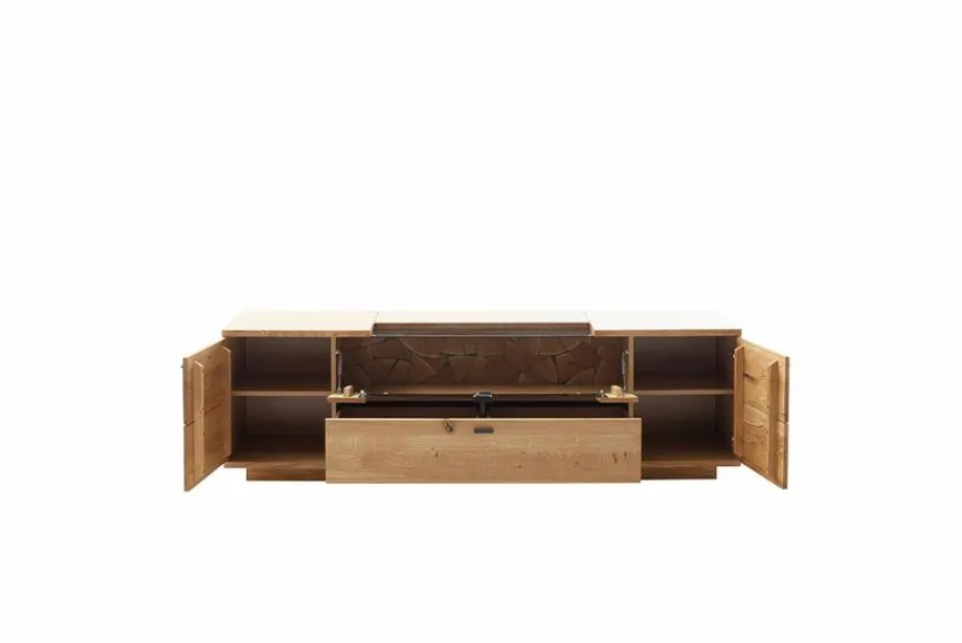 - Sichtbare Rückwand aus Scheitholz, Rückwand hinter Türen und Schubkästen aus Eiche Dekor