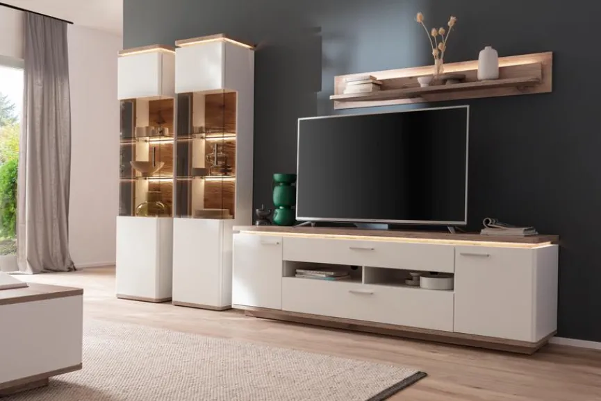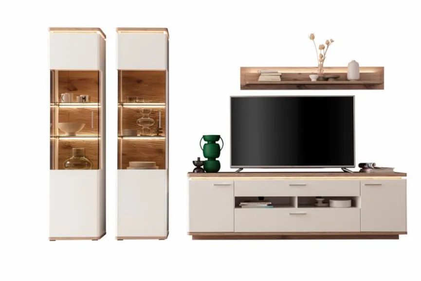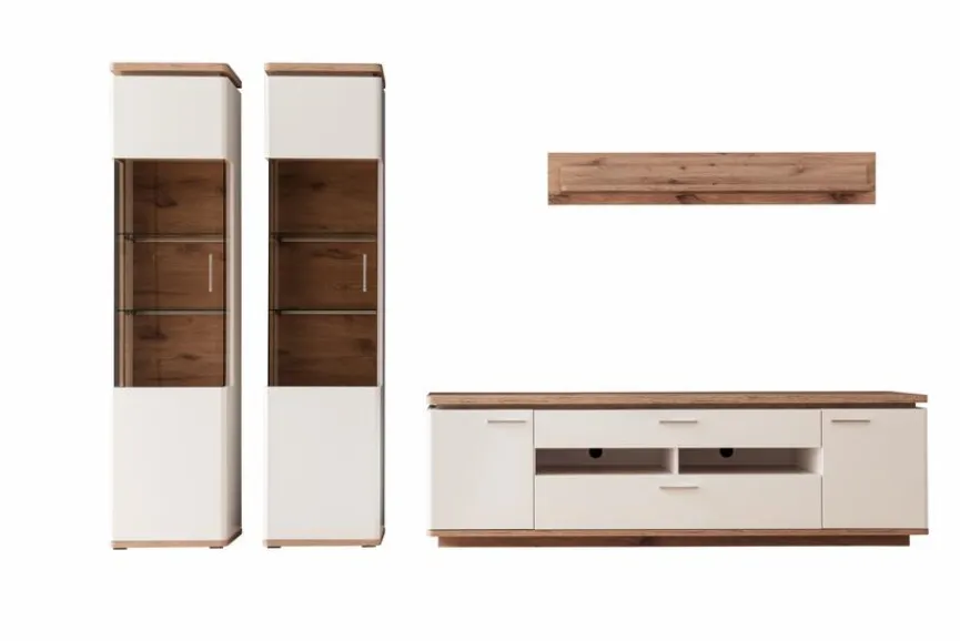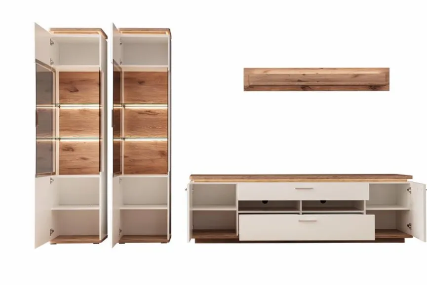 - Bestehend aus 2x Vitrine, TV-Lowboard und Wandboard
