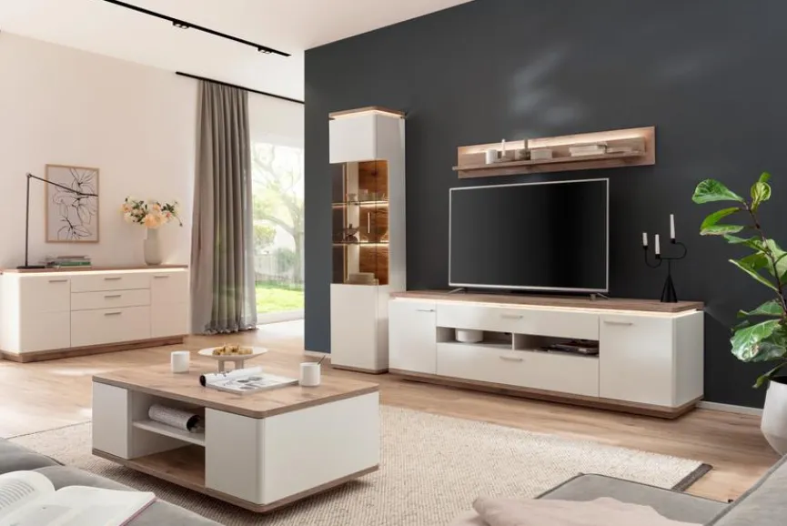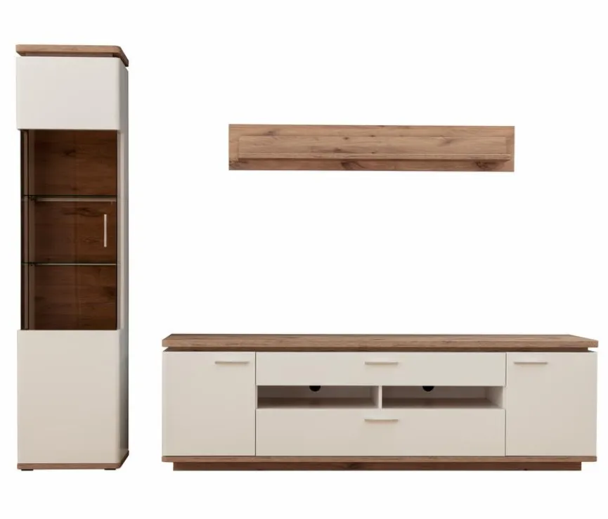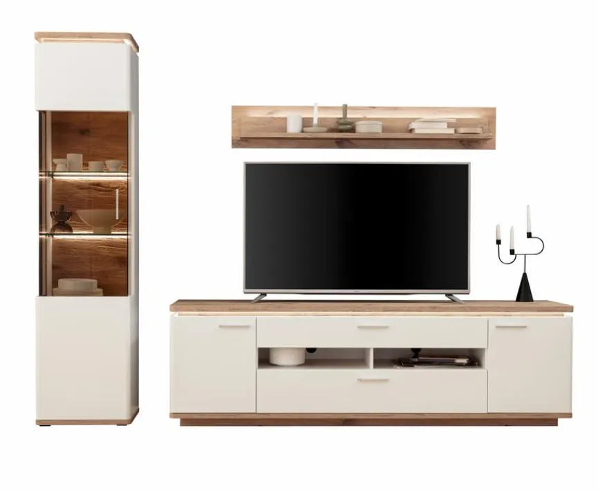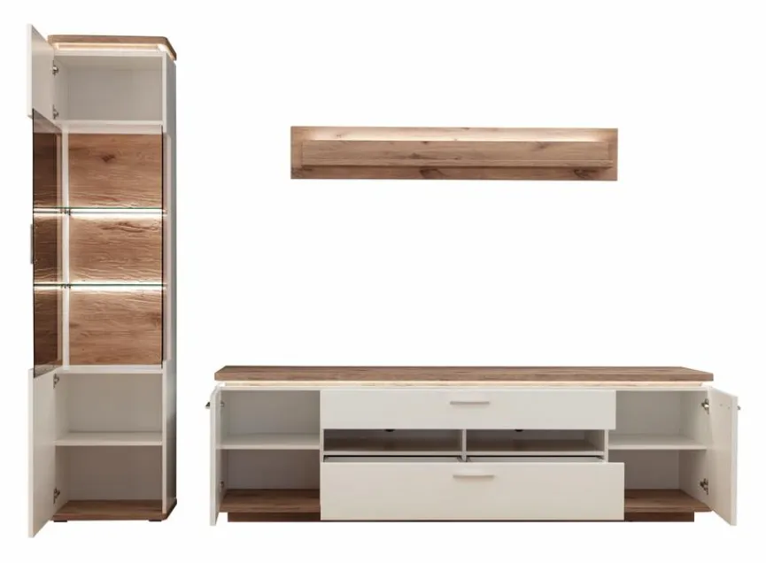 - Bestehend aus Vitrine, TV Lowboard und Wandboard