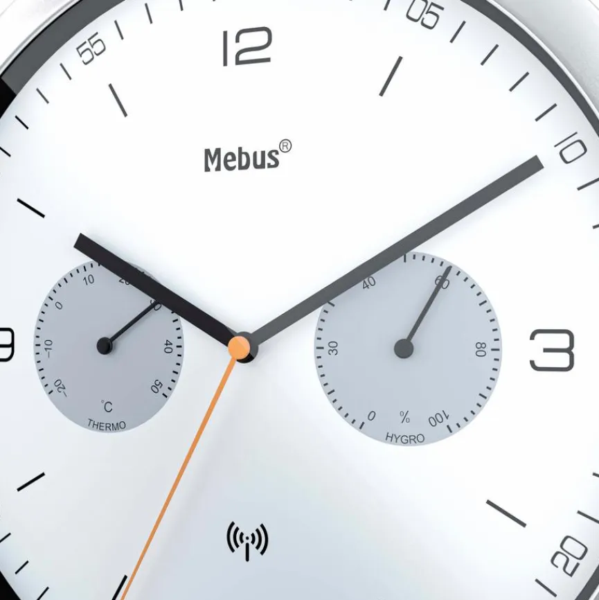 Die Funkwanduhr Ø 26 cm der Marke Mebus ist etwas ganz Besonders. Sie ist ausgestattet mit einem Thermo- und Hygrometer, sodass Sie nicht nur die Uhrzeit, sondern auch Temperatur und Luftfeuchtigkeit im Raum anzeigen kann. Damit eignet sich die Funkwanduhr Ø 26 cm von Mebus wunderbar dafür, um angenehme Raumbedingungen herzustellen.