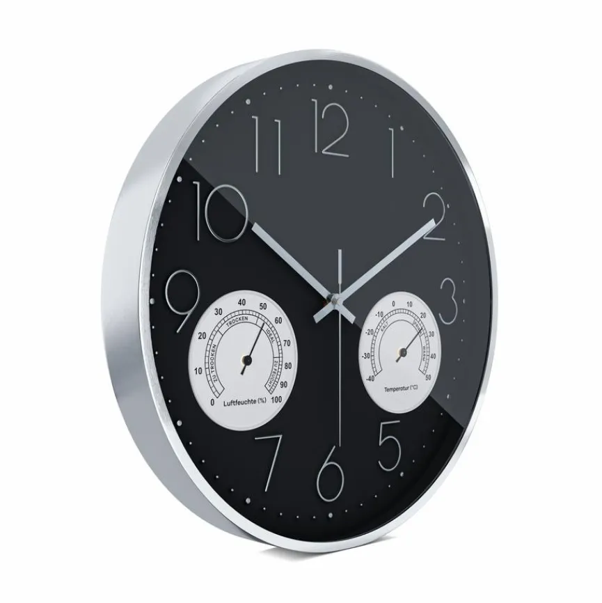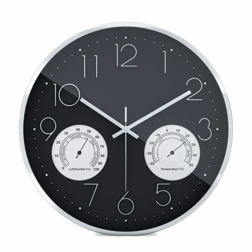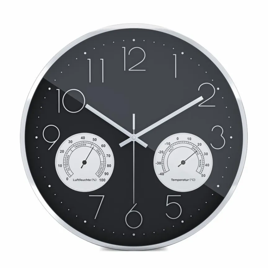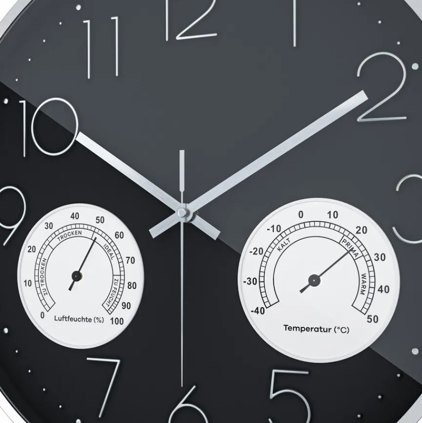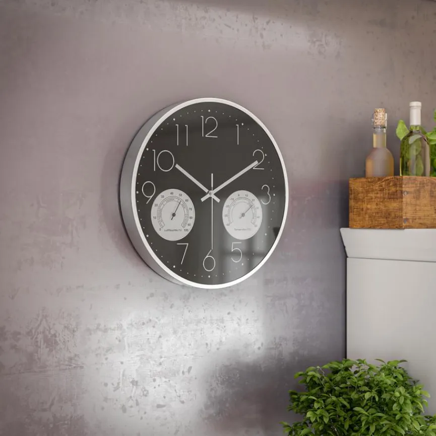 Bei der Mebus Quarzwanduhr 19639 Ø 35 cm sorgt ein kleiner Kristall für den gleichmäßigen Lauf. So wird die Uhrzeit stets korrekt angezeigt. Durch das integrierte Innen-Thermo- und Hygrometer sehen Sie die aktuelle Raumtemperatur und die Luftfeuchtigkeit. Darüber hinaus ist die angesagte Quarzwanduhr 19639 Ø 35 cm mit einem hochwertigen Aluminiumrahmen ausgestattet und lässt kein tickendes Geräusch von sich vernehmen.