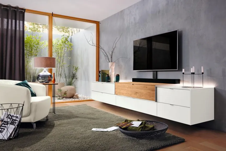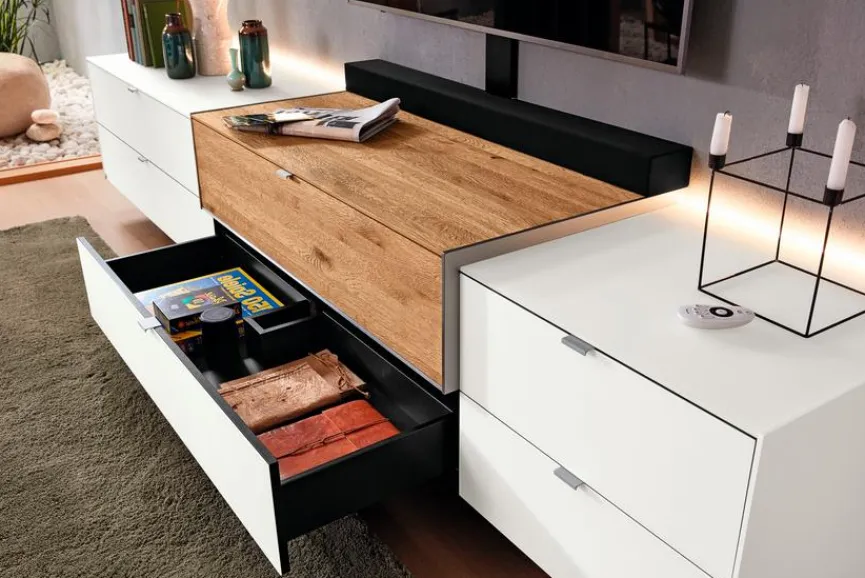 Mit dem Lowboard Q-Media 2.0 von Musterring schaffen Sie einen echten Blickfang in Ihren Räumlichkeiten. Das Sideboard ist sehr modern ausgeführt und lässt sich auch am besten mit Interieur in diesem Stil kombinieren. Neben dem zweckmäßigen Nutzen als Standort für Ihren Fernseher schafft das Lowboard Q-Media 2.0 auch Stauraum für Bücher, DVD’s oder Schallplatten.