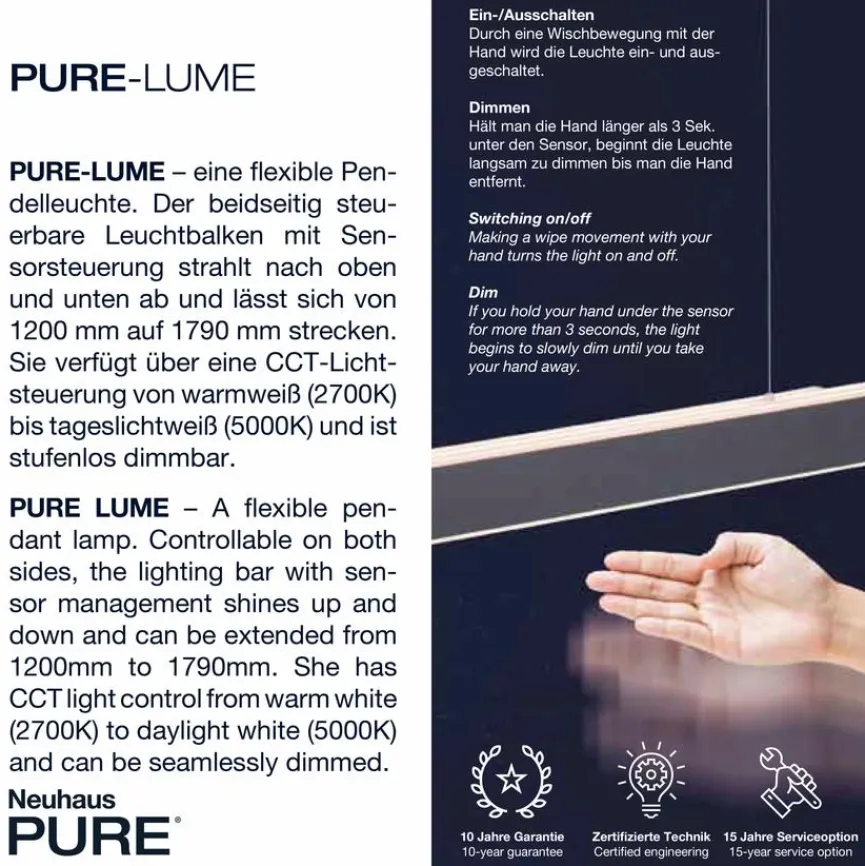 Die LED-Pendelleuchte Pure Lume von Paul Neuhaus vereint zeitloses, puristisches Design mit intelligenter Funktionalität. Anpassbare Länge und Höhe, intuitive Sensorschalter, variable Lichtfarben und stufenlose Dimmoption schaffen individuelle Lichtwelten. Die hochwertige Verarbeitung und die Energiespar-LEDs runden das moderne Gesamtpaket der LED-Pendellampe ab. Erleben Sie mit der LED-Pendelleuchte Pure Lume eine Welt, in der Lichtkunst und Technologie harmonieren.