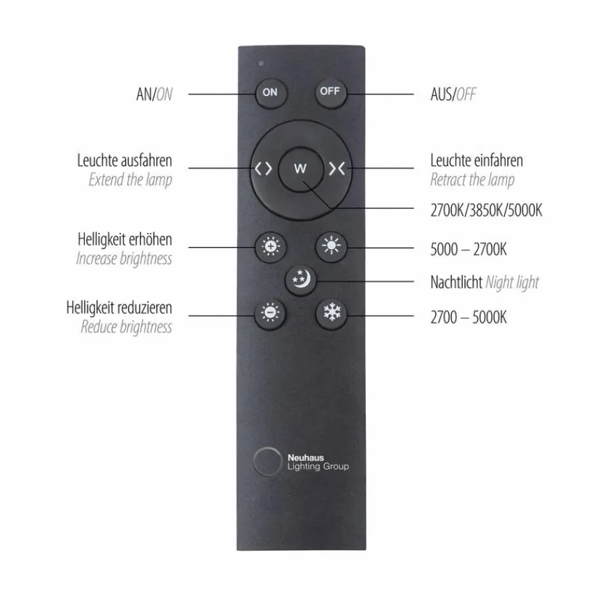 - Mit Fernbedienung und Sensortasten zum Dimmen, Einstellen der Farbtemperatur (2.700 – 5.000 Kelvin) und Einstellen der Leuchtenbreite