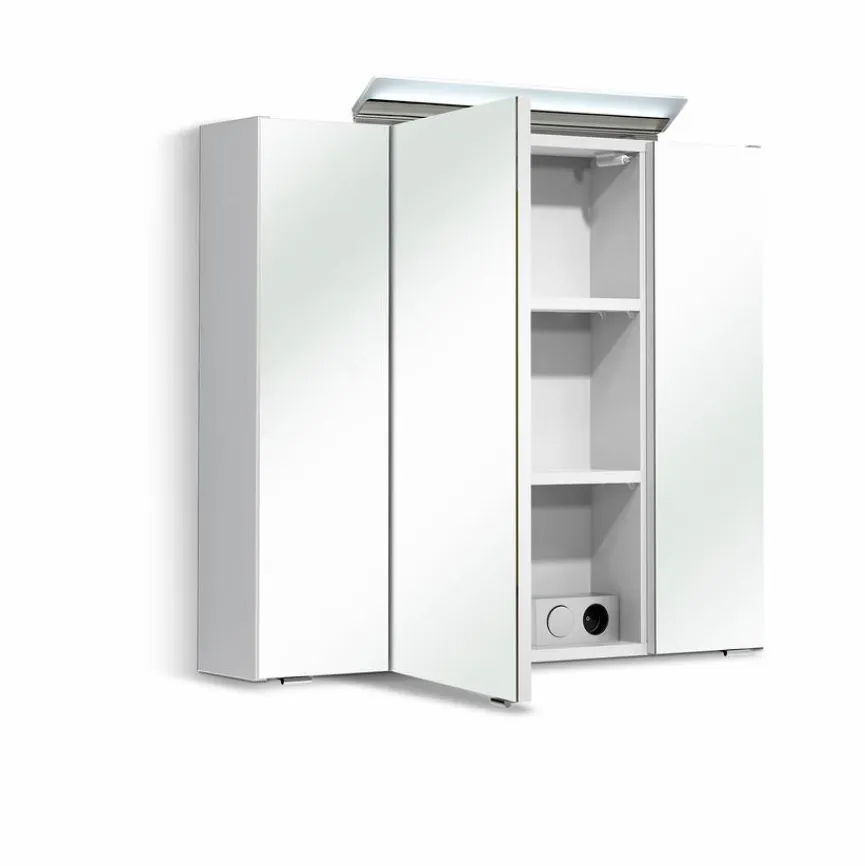 In dem mit sechs Einlegeböden ausgestatteten Spiegelschrank 53 II von Pelipal lassen sich die verschiedensten Utensilien vor Nässe und neugierigen Blicken geschützt unterbringen. Durch seine drei Spiegeltüren und den glänzenden Korpus gibt er dem Raum außerdem eine vornehme Note. Die am Spiegelschrank 53 II des Herstellers Pelipal angebaute LED-Bügelleuchte ist zudem energiesparend.