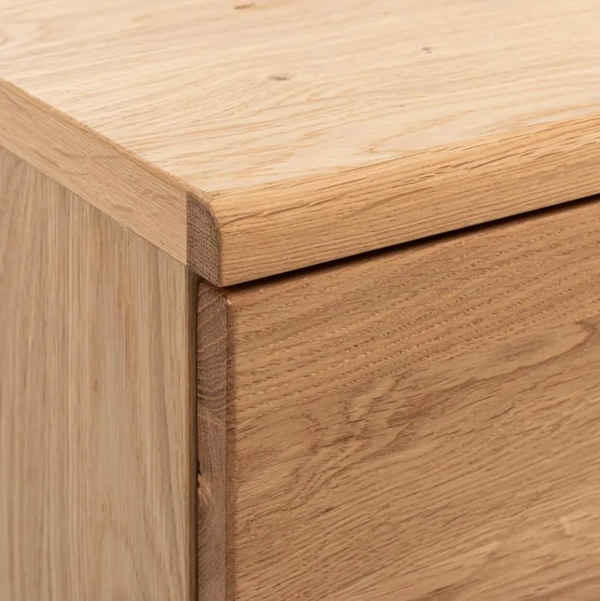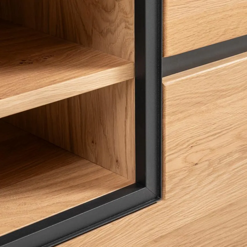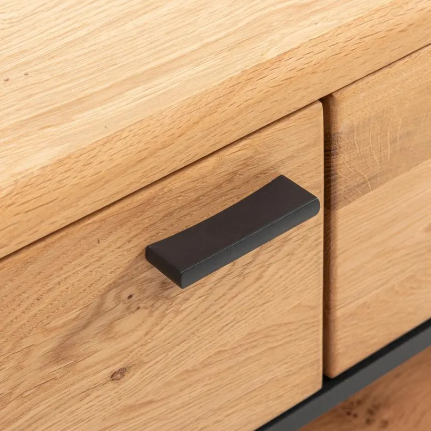 - Front aus vollmassiver Wildeiche, Korpus aus Holzwerkstoff (Spanplatte) mit hochwertiger Dekorfolie in Wildeiche furniert, Absetzung aus geölter Natureiche mit Ornament in Anthrazit