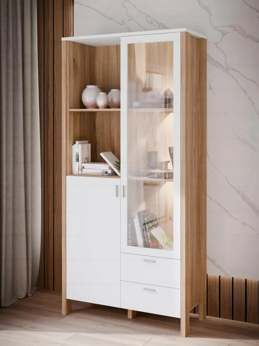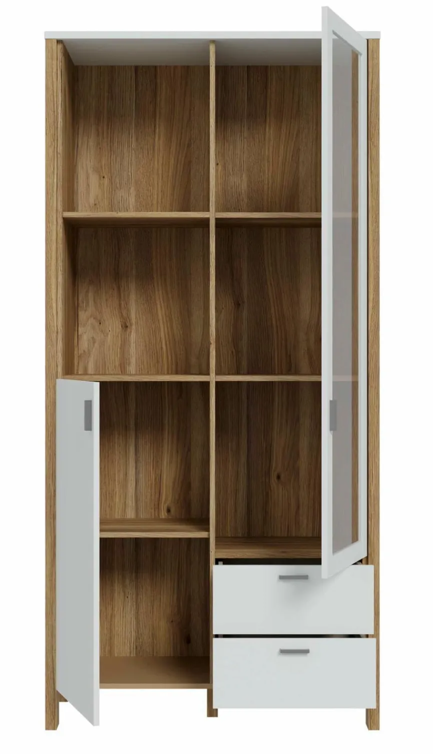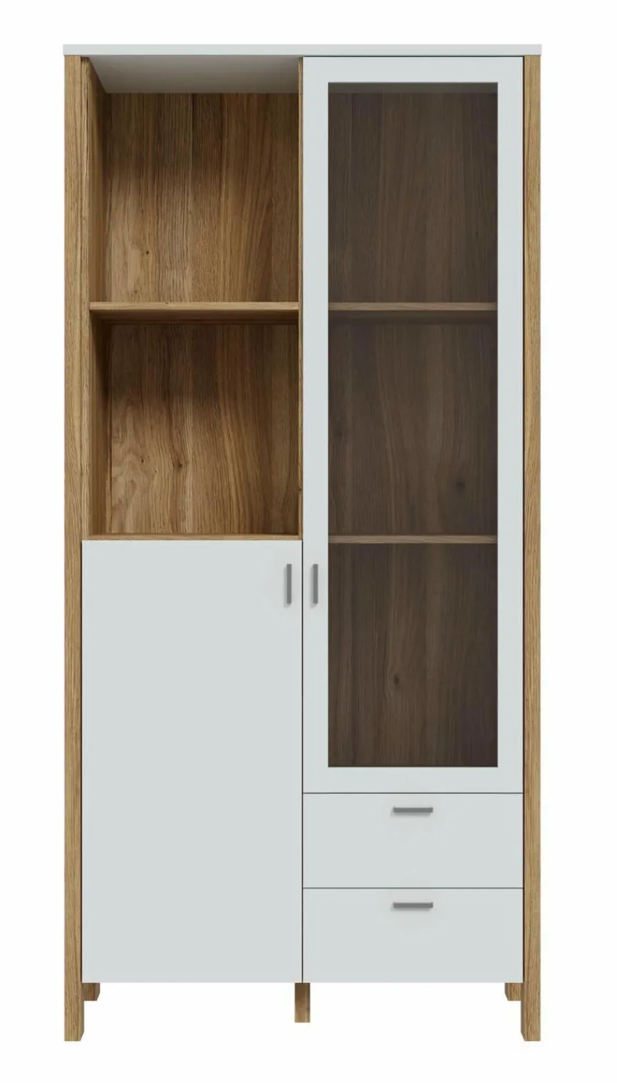 - Mit 2 Türen (1 Türe mit Glaseinsatz), 2 Schubkästen und 2 offenen Fächern