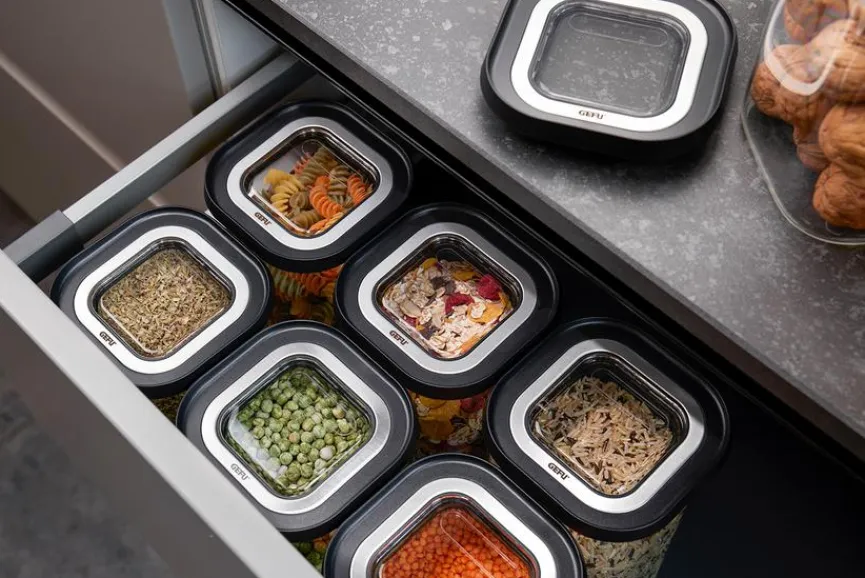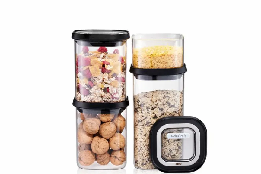 Trockene Lebensmittel lassen sich hygienisch, aromageschützt und luftdicht in der stapelbaren Vorratsdose Pantry 4tlg. von GEFU aufbewahren. Dank der transparenten Gestaltung ist auf den ersten Blick zu erkennen, was sich in dem jeweiligen Gefäß befindet. Bei Bedarf können Sie die Vorratsdose Pantry 4tlg. mit den 12 selbstklebenden und zu beschriftenden Etiketten versehen, die im Lieferumfang enthalten sind.