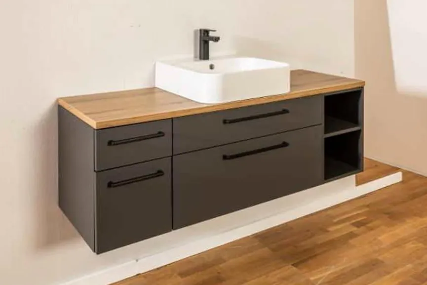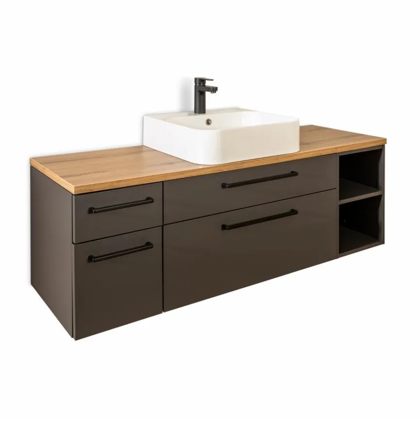 - Inkl. Waschtischplatte mit Dickkante, Stärke ca. 2,5 cm in aus Holzwerkstoff (Spanplatte) mit hochwertiger Dekorfolie in Vulkaneiche