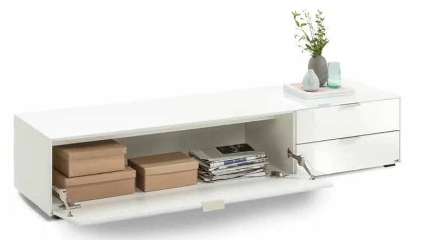 - Aus Holzwerkstoff (Spanplatte), Korpus mit kratzfester Melaminharzfolie in weiß matt, Front und Oberplatte aus Glas glänzend weiß lackiert