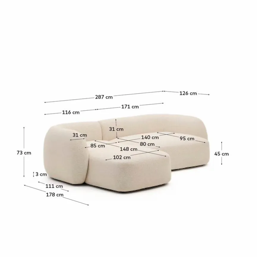 Im angesagten Scandi-Stil besticht das Ecksofa Martina von Kave Home durch organische Formgebung und fließende Linien, dank derer es zum hervorragenden Beispiel für moderne Wohnkultur avanciert. Mit weichen Polstern und haptisch überaus angenehmem, weichem Chenillestoff lädt diese Eckcouch zum Hinsetzen, Anschmiegen und Relaxen ein. Pur und minimalistisch setzt das Ecksofa Martina optisch einen klaren Akzent und avanciert zum außergewöhnlichen Interior-Statement.