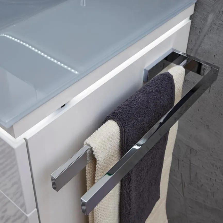 Der Handtuchhalter Puris PZ11281 besteht aus zwei metallenen Stäben, welche am hinteren Ende durch einen Steg miteinander verbunden sind. Das Mittelstück kann einfach am Korpus des Badezimmerschranks montiert werden. An den Metallhaltern sind zwei runde Abschlusskappen angebracht. Der Handtuchhalter Puris PZ11281 ist ein nützlicher Bestandteil einer vollständigen Badezimmereinrichtung.