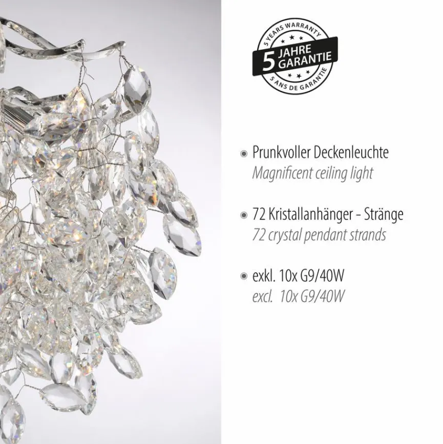 Die elegante Deckenleuchte Ricicle von Paul Neuhaus begeistert mit ihrem glänzenden Chrom-Finish und funkelnden Kristallanhängern, die jedem Raum das gewisse Extra verleihen. Mit bis zu 10 G9 Glühbirnen bis maximal 40 W ausgestattet, sorgt die Deckenlampe für eine gleichmäßige, helle Beleuchtung und schafft ein einladendes Ambiente. Ob im Wohnzimmer, Esszimmer oder Flur – die Deckenleuchte Ricicle setzt stilvolle Akzente.