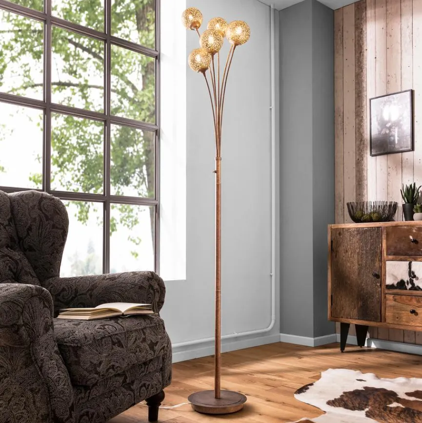 Einen außerordentlich extravaganten und dekorativen Eindruck hinterlässt die Stehlampe Greta von Paul Neuhaus. Besonders schön wirkt bei dieser Stehleuchte die Komposition aus den mit einem Muster versehenen Lichtkugeln und dem rustikal anmutenden, filigranen Gestell. Damit ist die Stehlampe Greta aus dem Hause Paul Neuhaus eine vorzügliche Wahl, wenn Sie Ihrem Raumambiente das gewisse Etwas verleihem möchten.