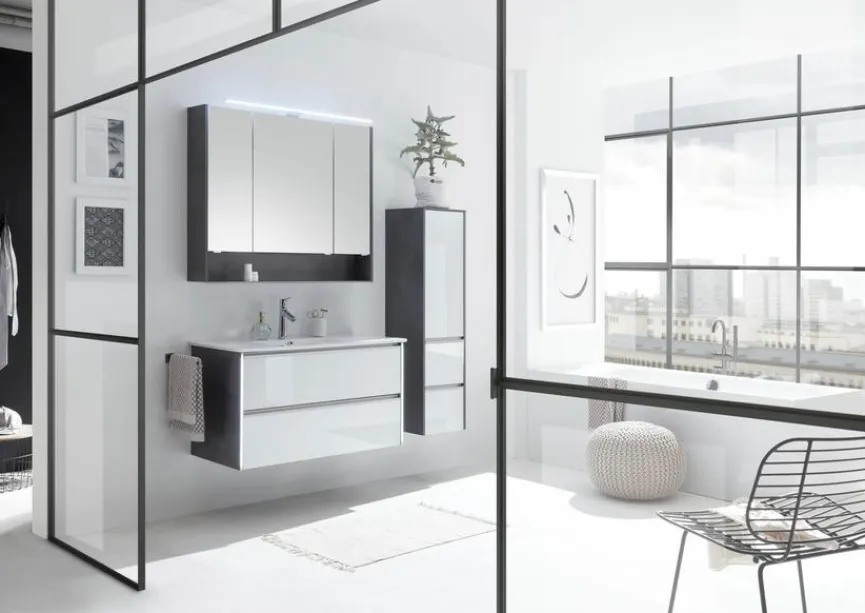 - Inkl. Waschtischunterschrank mit 2 Auszügen und Kosmetikeinsatz im oberen Auszug 2-teilig