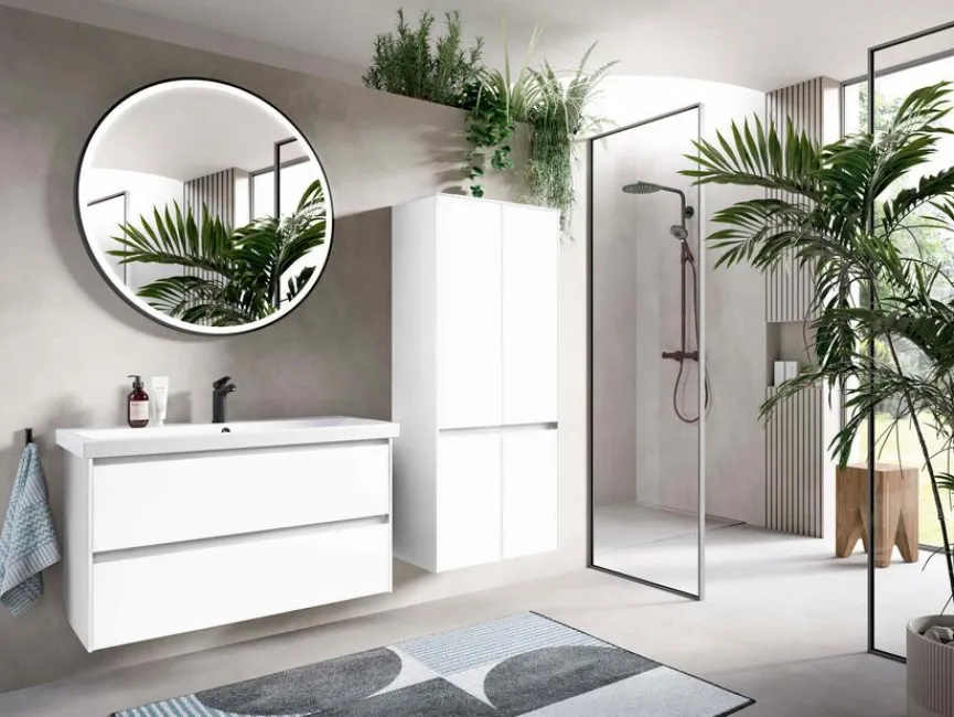 - Bestehend aus Keramik-Waschtisch in Weiß, mit Armaturbohrung und integriertem Überlauf, Waschtischunterschrank Grifflos, mit 2 Auszügen, mit Siphonausschnitt