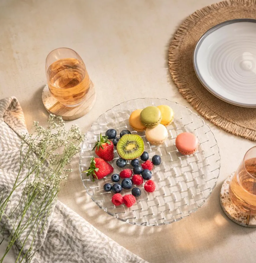 Vielseitig nutzen lässt sich die attraktive Platte Ø 24,2 cm, die auf interessante Weise in sich gemustert ist. Richten Sie auf der Servierplatte kleine Snacks an, reichen Sie darauf Kekse und Süßigkeiten, verwenden Sie sie für Aufschnitt oder als Kuchenplatte. Dank ihres dezenten Stils harmoniert die Platte Ø 24,2 cm mit jeder Art der Einrichtung.