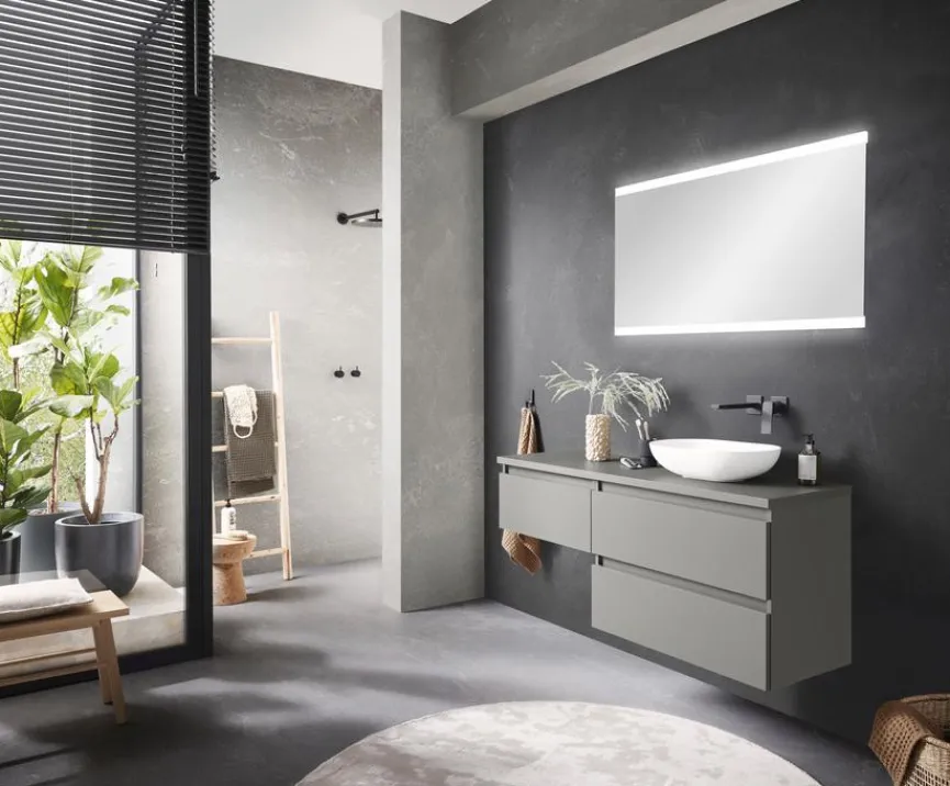 - Mit Waschtischplatte in Betongrün 120,8 cm inklusive Waschtischplatten-Ausschnitt mit Armaturbohrung mittig vom Becken.