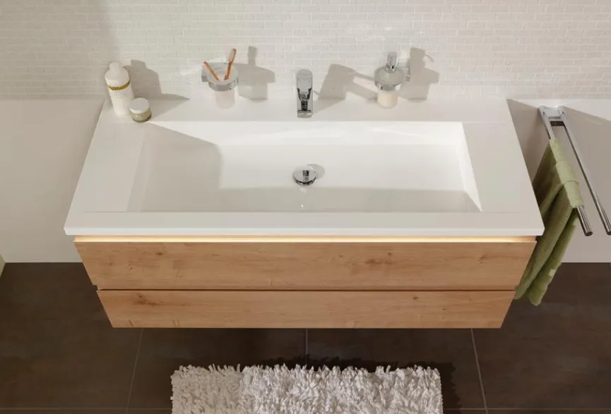 - Bestehend aus Waschtischunterschrank mit 1 Metallauszug mit Einzugsdämpfung und Siphonausschnitt, inklusive 1 alufarbige Auszugseinteilung, 1 Metallauszug mit Einzugsdämpfung und Reling, 1 Raumsparsiphon
