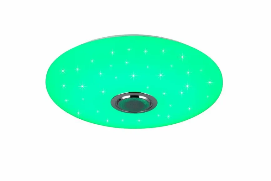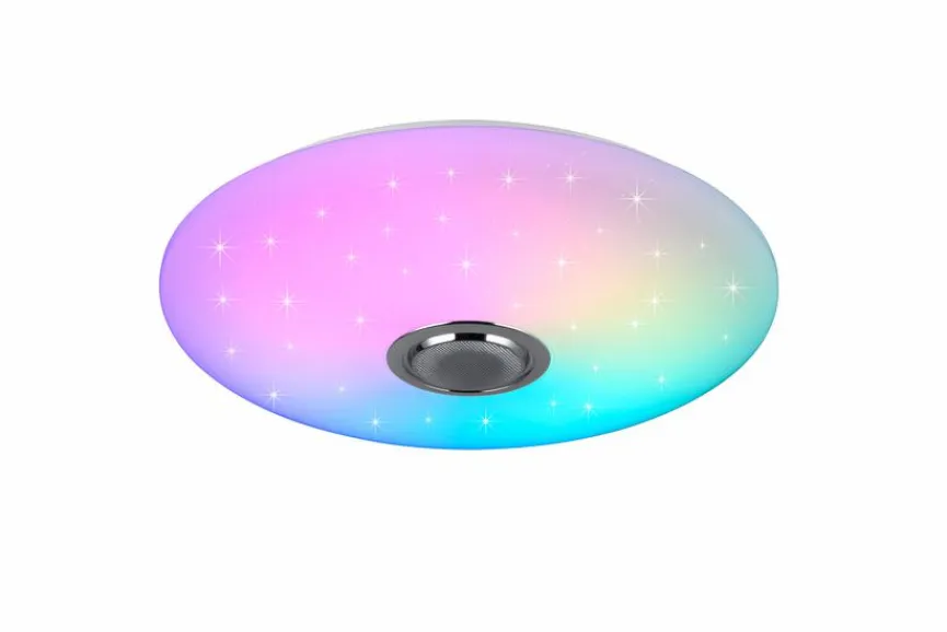 - Mit Fernbedienung zum Dimmen, Einstellen der Farbtemperatur (2.700 bis 6.500 Kelvin), Veränderung der Lichtfarbe (RGB) und Bedienung des Bluetooth-Lautsprechers