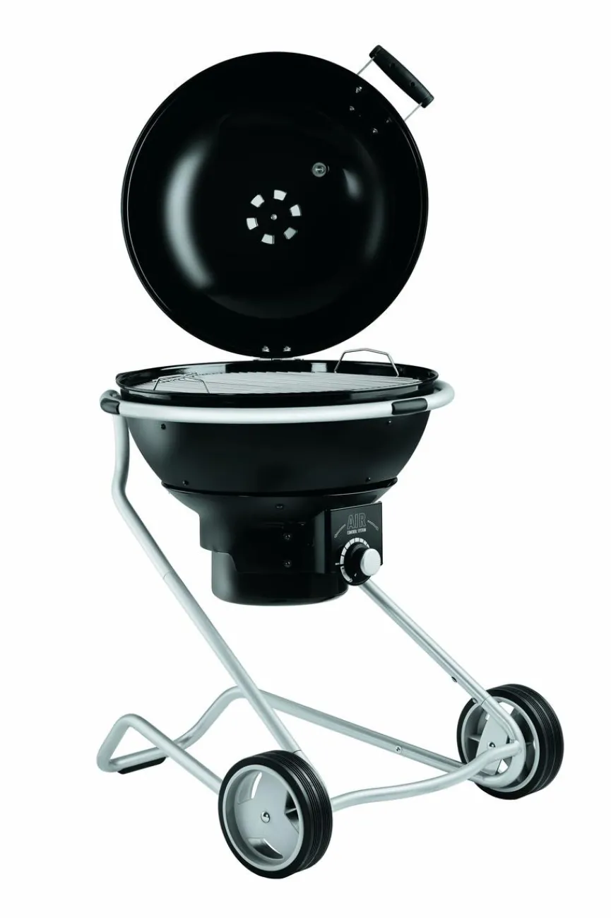 - Inkl. robustem Deckelgriff, integriertem Thermometer und 2 Kohlekörben