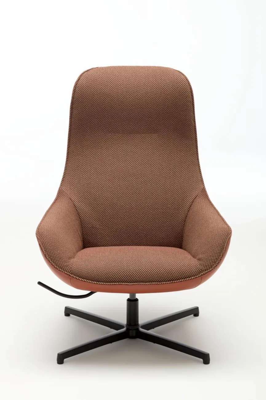 - Sitzbezug aus Stoff in rotbraun (24.514), Korpusbezug aus Leder in kupferbraun (38.112), Kreuzfuß in RAL9017 verkehrsschwarz