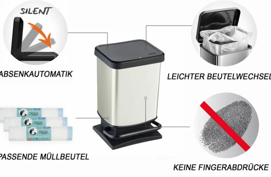 Der Treteimer Paso 20l darf in keinem Haushalt fehlen. Durch seine eckige Form nimmt der Abfalleimer nicht viel Raum ein und der durchdachte Öffnungsmechanismus ist leicht mit dem Fuß zu bedienen. So können Sie einfach und schnell Ihren Abfall sicher entsorgen. Platzieren Sie am besten gleich mehrere der Treteimer Paso 20l nebeneinander, dann lässt sich Ihr Müll zuverlässig trennen.