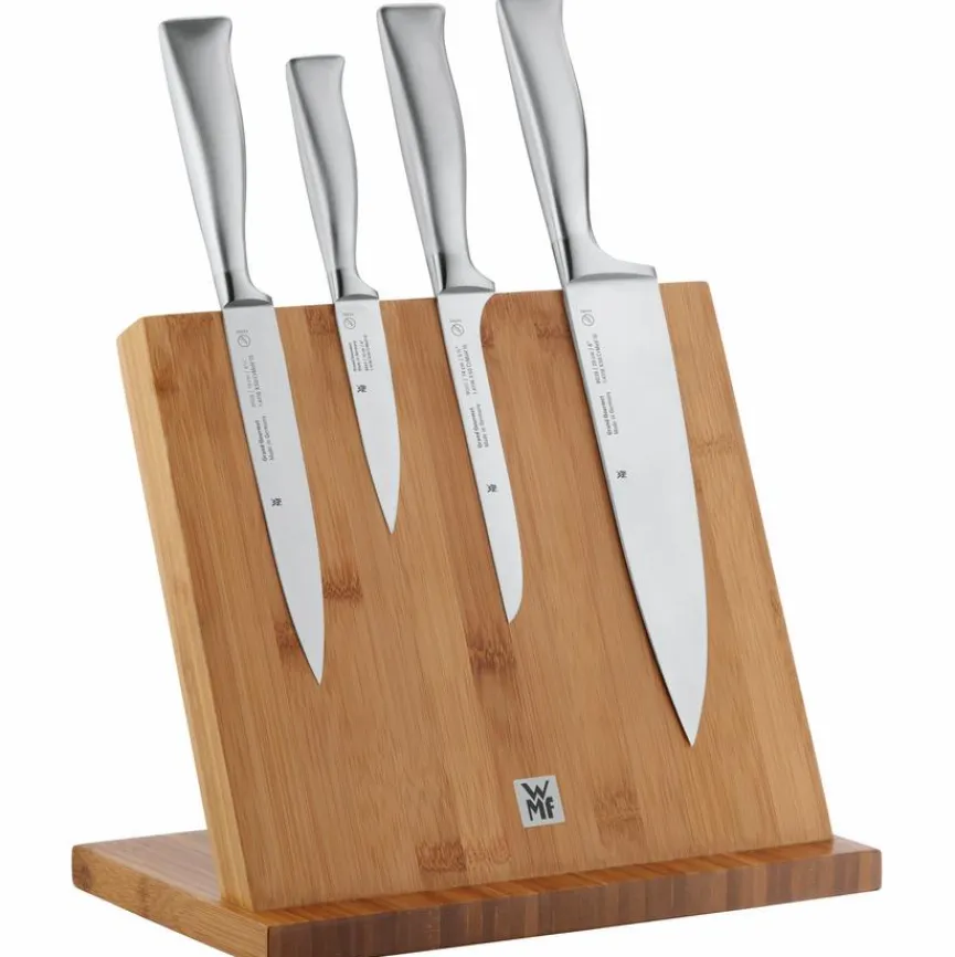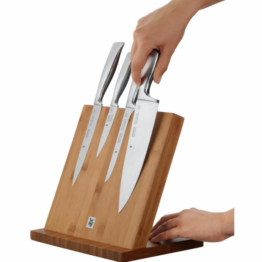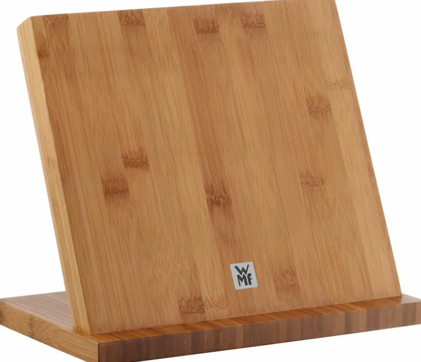 Mit dem Messerblock 27 x 26 x 17 cm aus dem Hause WMF besteht die Möglichkeit, diverse Messer übersichtlich und vor allem griffbereit aufzubewahren. Metallische Gegenstände bleiben einfach an der Oberfläche des schräg gestalteten Bretts haften, da es magnetisch ist. Der Messerblock 27 x 26 x 17 cm der Marke WMF besteht aus Bambusholz.