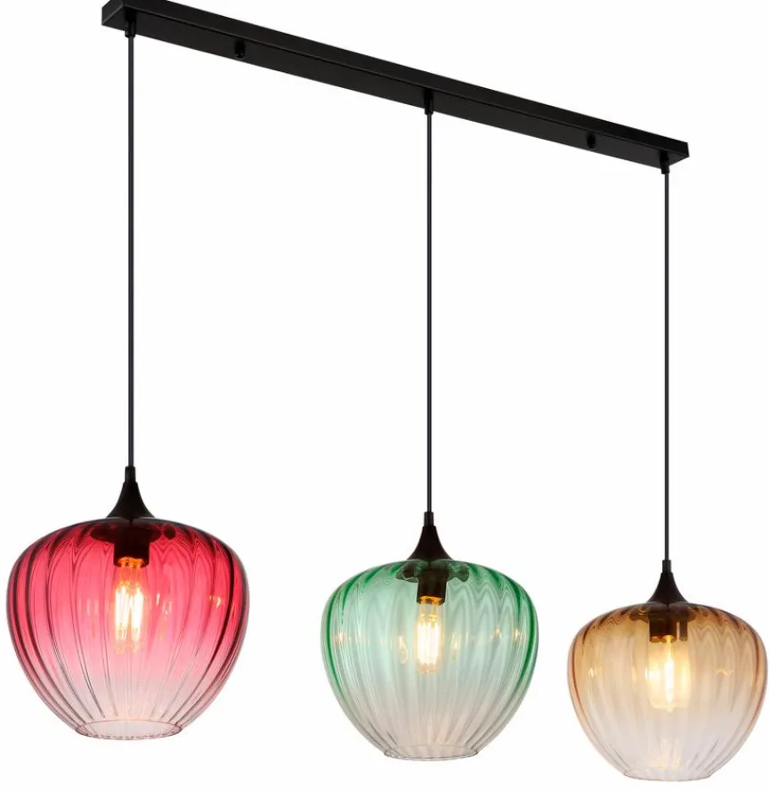 Die Pendelleuchte Solveig von Globo begeistert mit ihren drei kunstvoll gerieften Glasschirmen in unterschiedlichen Farbnuancen. Die harmonische Kombination aus dem Gestell und den transparenten, farbigen Glaskörpern schafft bei der Pendellampe eine besonders stimmungsvolle Atmosphäre in Ihrem Zuhause. Jeder Schirm der Pendelleuchte Solveig umhüllt eine dekorative Glühbirne, die das Licht sanft durch das strukturierte Glas streuen lässt.