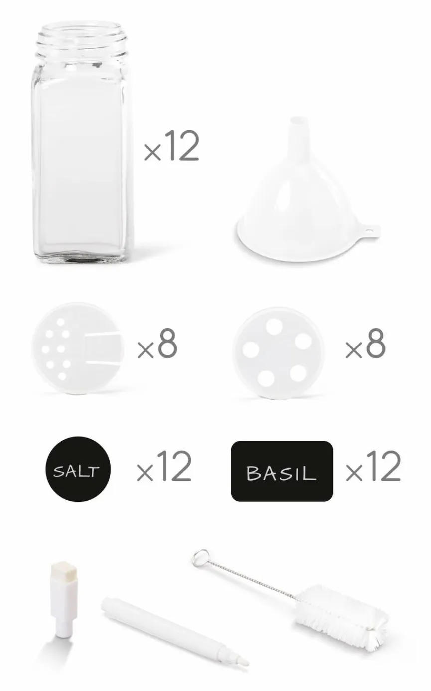 - Artikel beinhaltet 12x Gewürzstreuer, 16 austauschbaren Streueinsätzen (8x fein, 8x grob) und 24 selbstklebenden Etiketten (12x rund, 12x rechteckig)