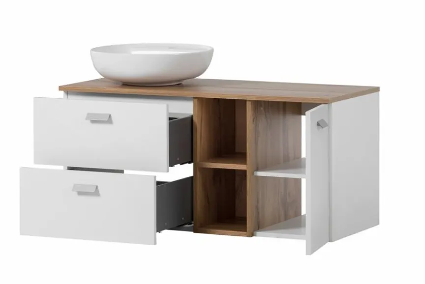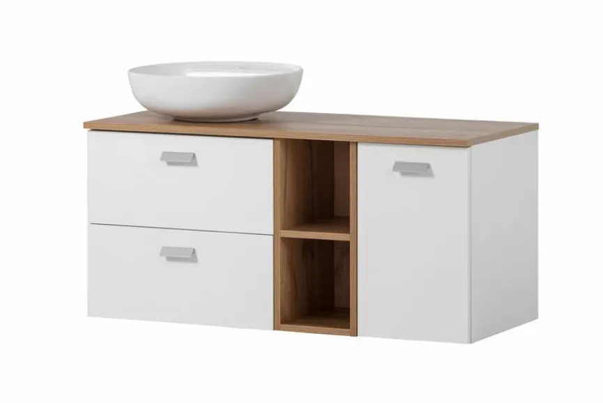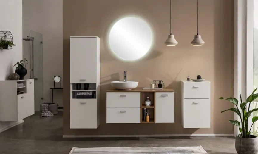 Ihr modernes, geradliniges Design macht die Waschtischkombination Mona der Marke Schildmeyer zum einzigartigen Hingucker in Ihrem Badezimmer. Dieses attraktive Badezimmermöbel überzeugt mit einer ansprechenden Kombination aus Holzoptik und unifarbenen Elementen. Die Waschtischkombination Mona bietet wunderbar Platz für Ihre persönlichen Badutensilien und macht Ihr Pflegeritual zum täglichen Vergnügen.