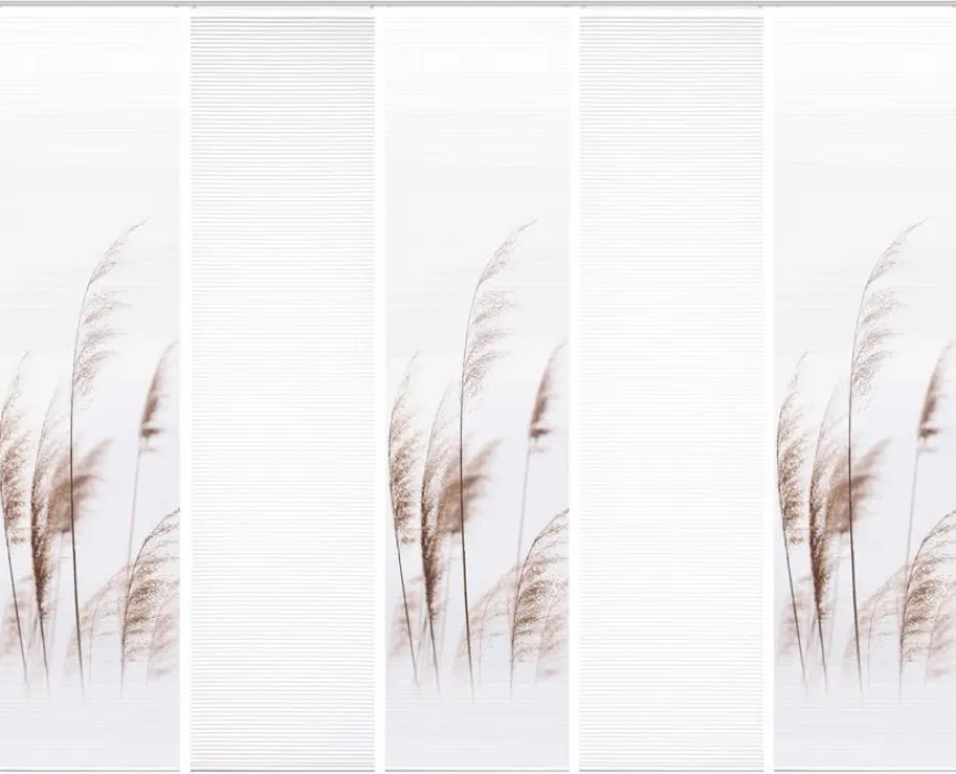 - Artikel beinhaltet zwei unifarbene und drei gemusterte Schiebevorhänge, Paneelwagen inkl. Gleiter und Aluklemmleiste