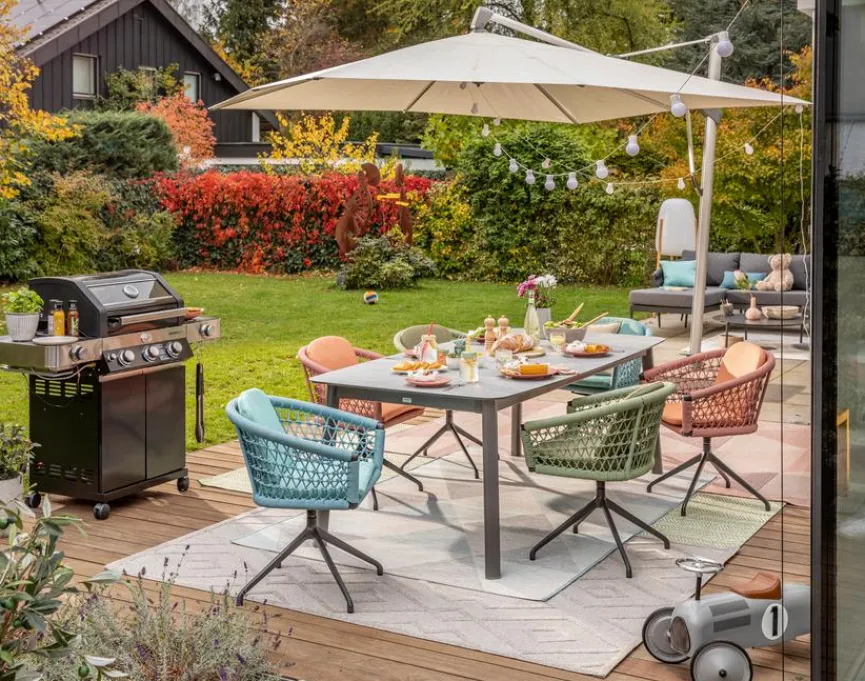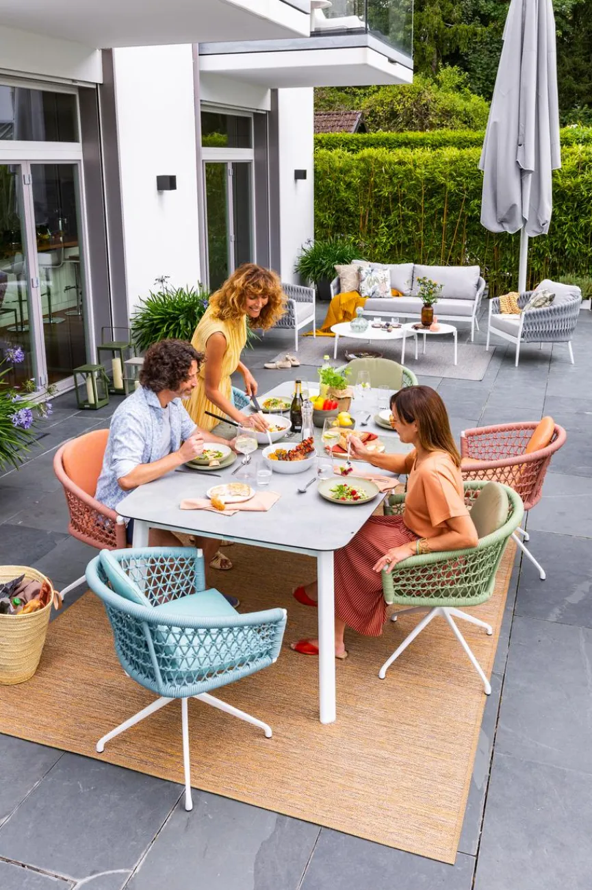 Leicht, strapazierfähig und langlebig – diese Eigenschaften machen die neue Generation von Gartenmöbeln aus Polyester Rope und Aluminium aus. Das Seilgeflecht sieht nicht nur trendig aus, sondern sorgt für eine gleichmäßige Verteilung des Gewichts des Sitzenden und schließt somit ein Verformen aus. Aufgrund der porenfreien, glatten Oberfläche der beiden Materialien ist das Gartenmöbel leicht durch Abwischen mit klarem Wasser zu reinigen. Sowohl Aluminium als auch Polyester Rope sind besonders robust und bereiten Ihnen viele Sommer lang große Freude.