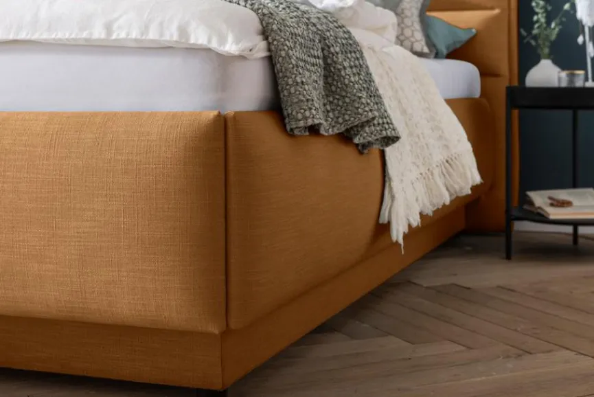 Bettkästen werden mit komplett gelochter Bodenplatte – zur besseren Bettkastenbelüftung – gefertigt; durch den stoffbezogenen Sockel wird der Stauraum im Bettkasten größer