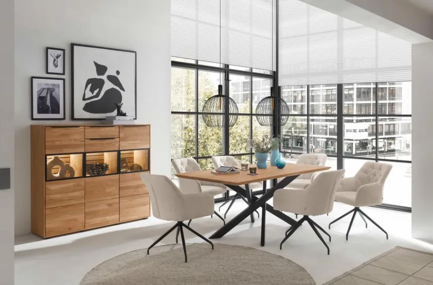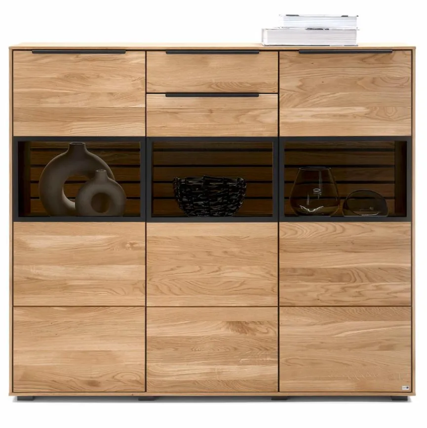 - Korpus aus Holzwerkstoff (Spanplatte) in Echtholz Eiche furniert, Front aus massiver Eiche