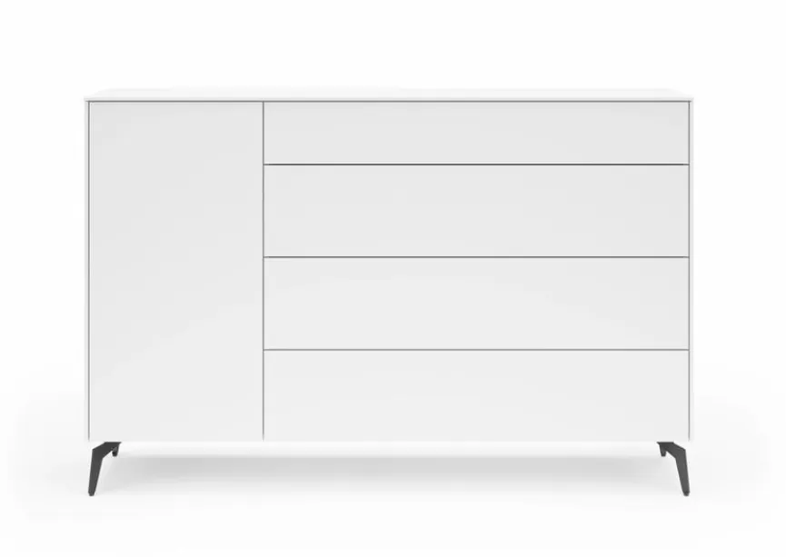Dezente Eleganz und zeitlose Optik zeichnen die Kommode Riverside von set one by Musterring aus. Hinter einer Tür und in vier Schubladen findet sich reichlich Platz, um Geschirr, Tischwäsche, Accessoires oder andere liebgewonnene Dinge aufzubewahren. Dank der schlichten Farbgebung und der klaren Form passt die Kommode Riverside zu jedem modernen Einrichtungsstil.