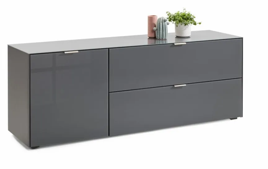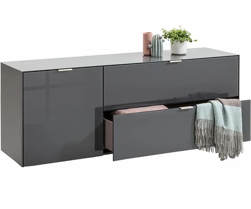 - Aus Holzwerkstoff (Spanplatte), Korpus mit kratzfester Melaminharzfolie in anthrazit matt, Front und Oberplatte aus Glas anthrazit glänzend lackiert