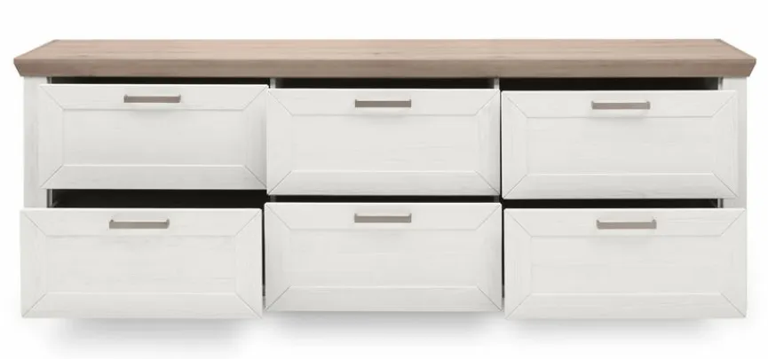 - Korpus aus Holzwerkstoff (Spanplatte) mit kratzfester Melaminharzfolie in Pino-Aurelio, Front aus Holzwerkstoff (MDF) in Pino-Aurelio, Absetzung in Eiche Nelson