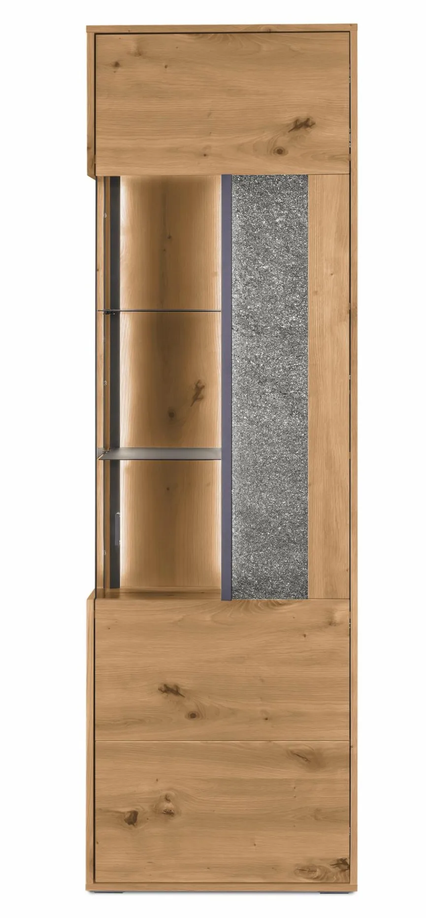 - Korpus und Front aus Holzwerkstoff (Spanplatte) mit kratzfester Melaminharzfolie in Eiche Artisan, Absetzung aus Steinfurnier in Black Pearl-Sandstone