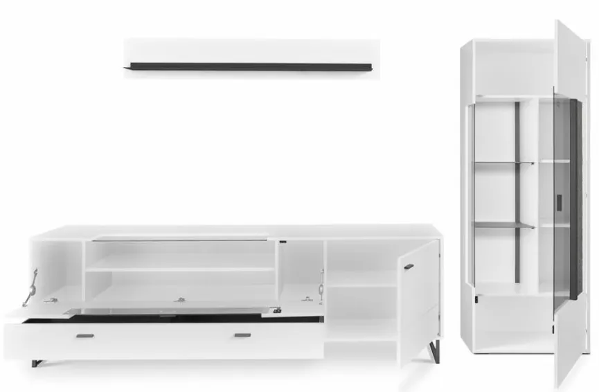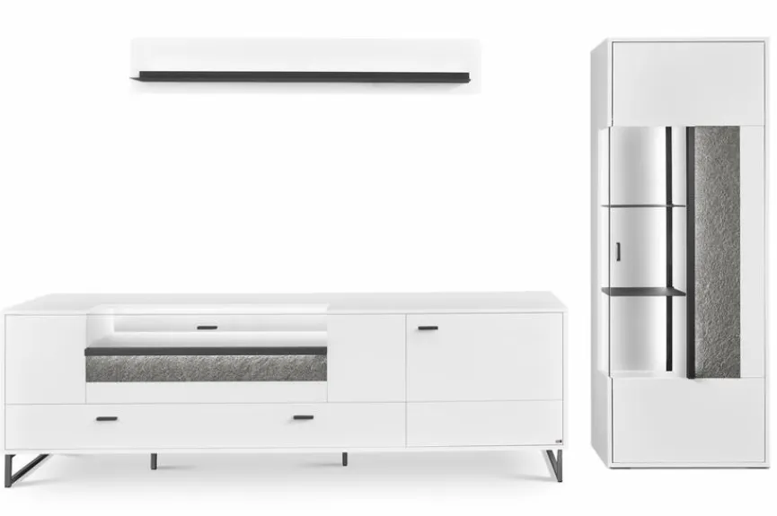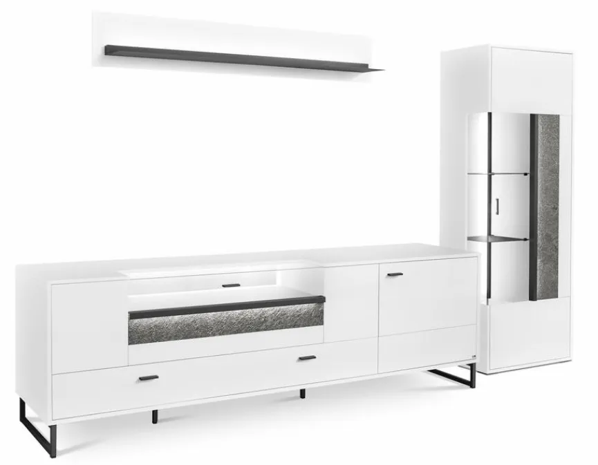 - Bestehend aus Vitrine, TV-Lowboard und Wandboard