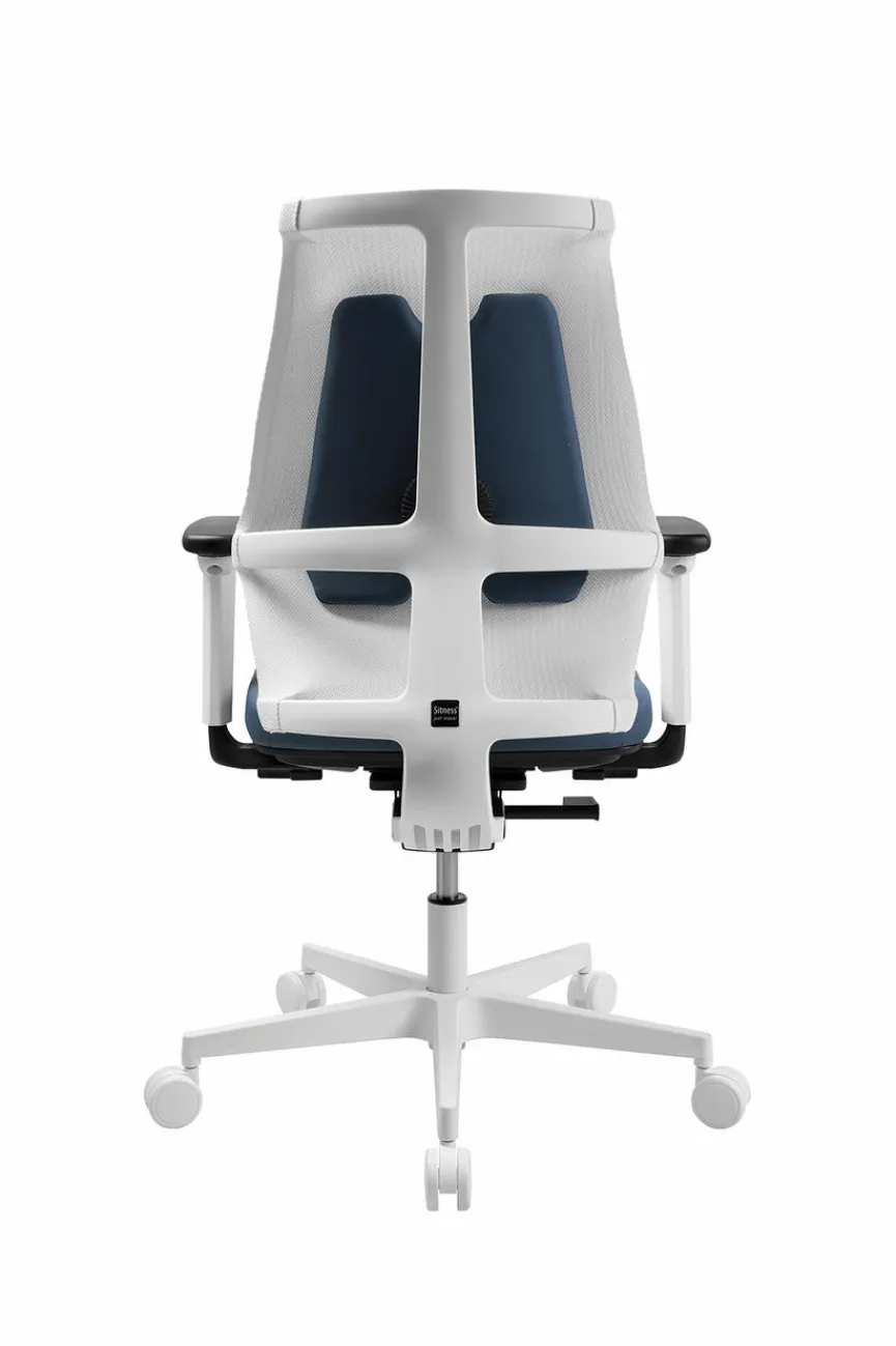 - Rückenlehne mit atmungsaktivem Netzbezug in weiß, Sitzbezug aus Stoff in blau, Fußkreuz aus Kunststoff in weiß