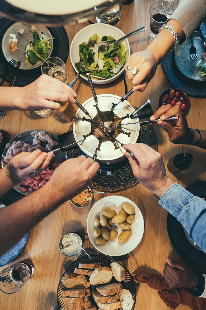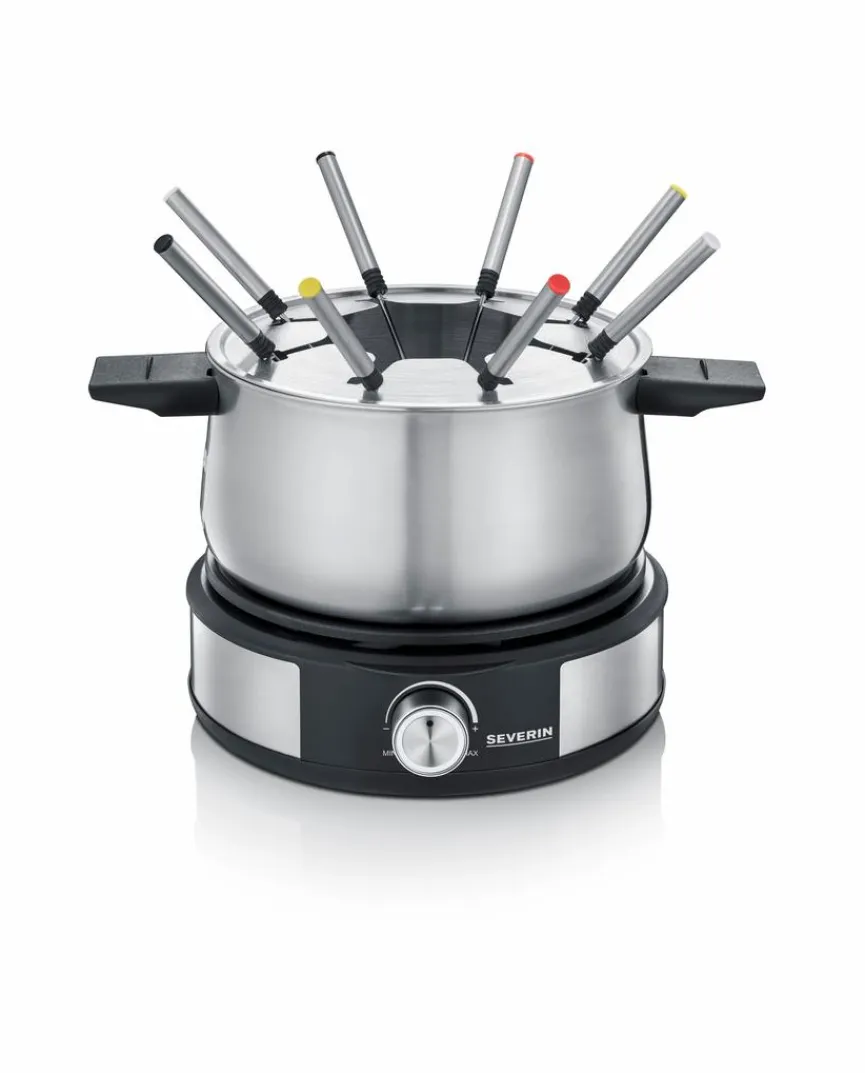 - Mit abnehmbarem Edelstahltopf, 8 Fonduegabeln, zusätzlicher Crepesplatte und Spritzschutz