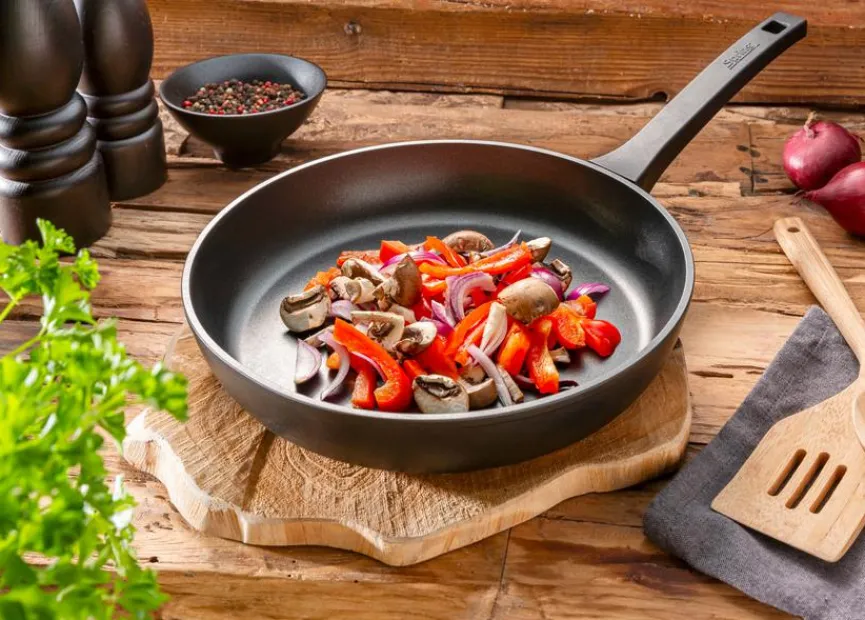 - Mit geschmiedetem Pfannenkörper, 3-fach Antihaftversiegelung, wärmeisolierendem Griff aus Duroplast und Vollflächeninduktionsboden