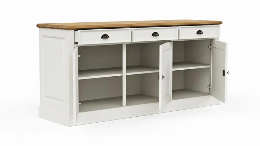 Wenn Sie ein Anhänger des Landhausstils sind, ist das wunderschön gezeichnete Sideboard Barreiro für Sie eine optimale Wahl. Korpus und Front der romantisch anmutenden Kommode bestehen aus Pappel und MDF. Punkte sammelt das Sideboard Barreiro zudem dank der stilvollen Muschelgriffe der Schubfächer und der attraktiv herausgearbeiteten Türen.