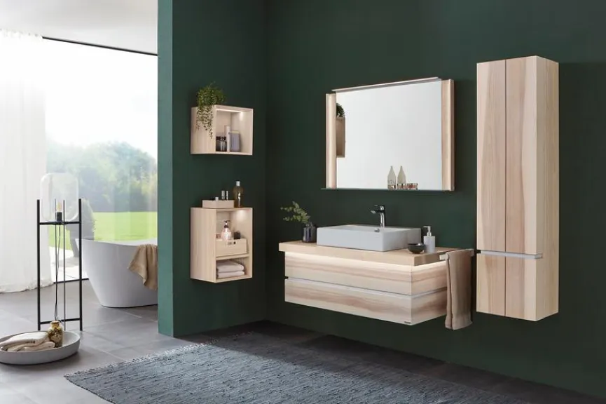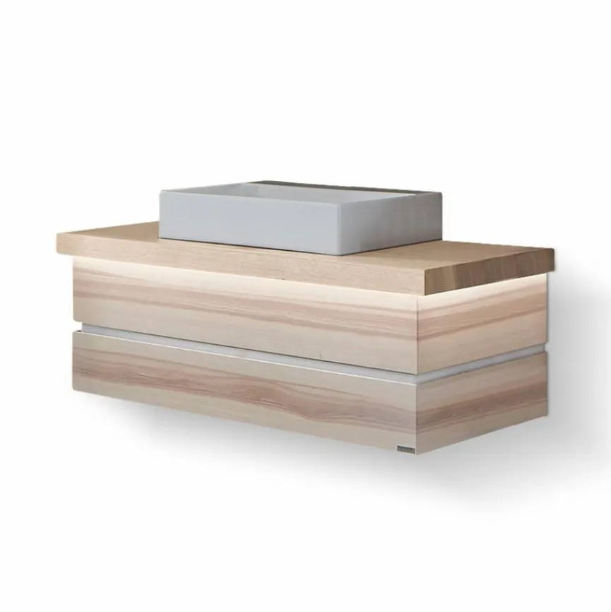 - Waschtischplatte in Esche massiv mit Aufsatzbecken Keramik weiß mit Armaturbohrung und Überlauf, 1 Raumsparsiphon, 1 Permanentablauf inkl. Abdeckung in chrom